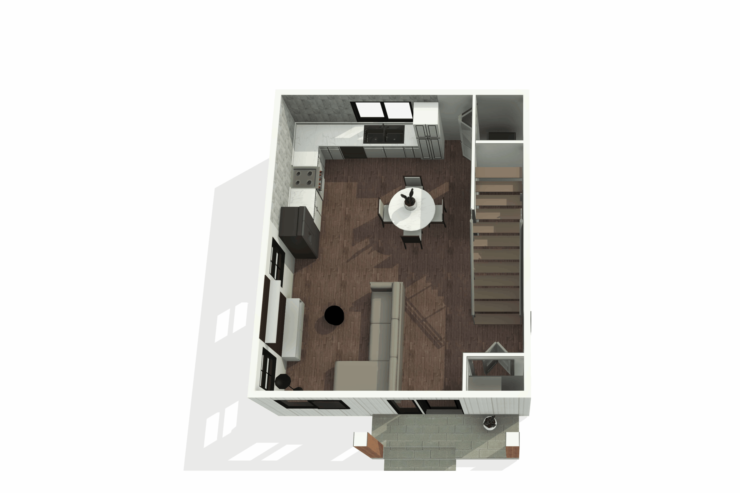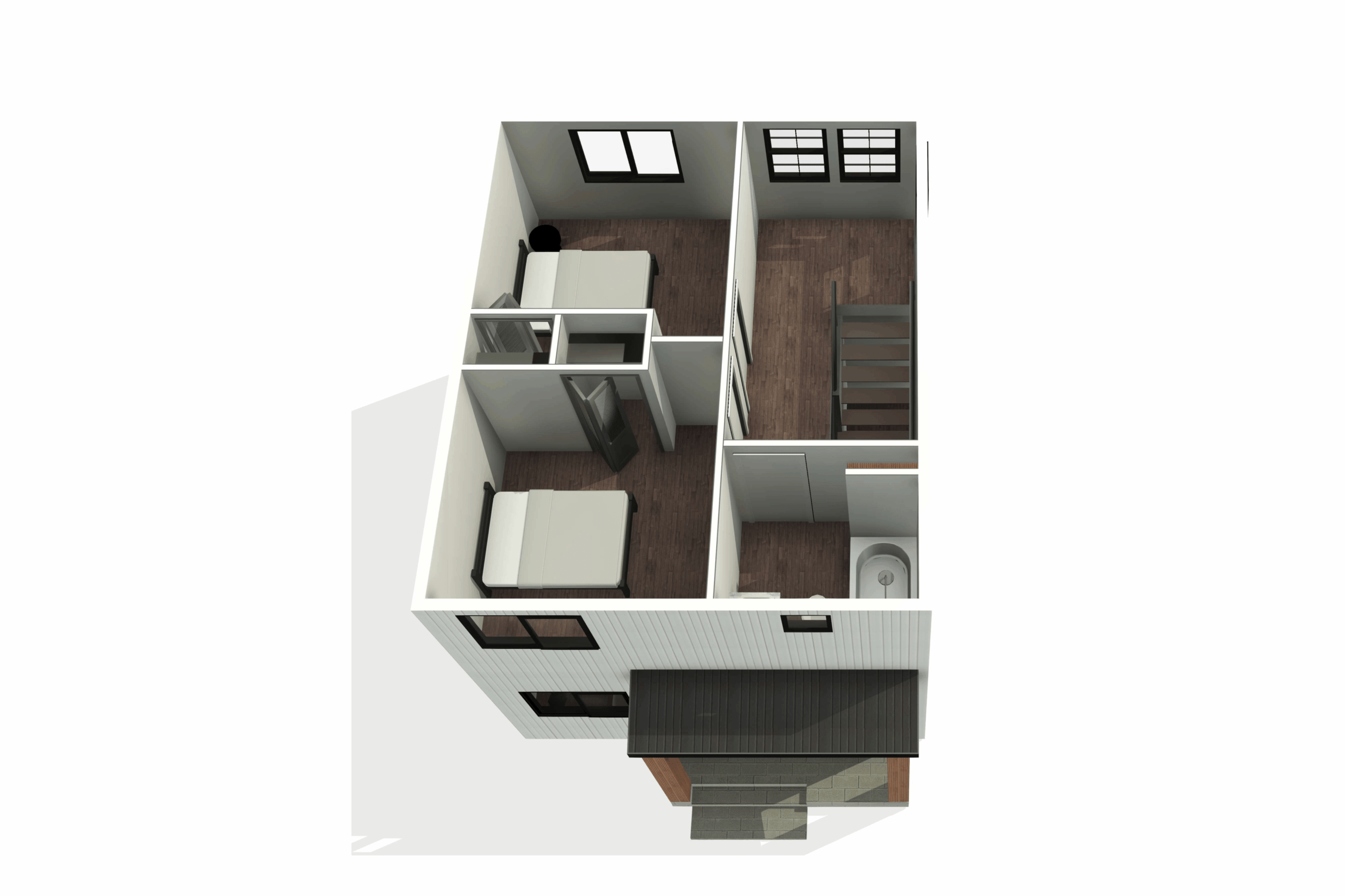 This space-saving two-story design fits two bedrooms into a compact footprint. The ground floor features an open living room and kitchen opening onto a patio, while the upper floor maximizes sleeping space with two bedrooms and built-in shelving.