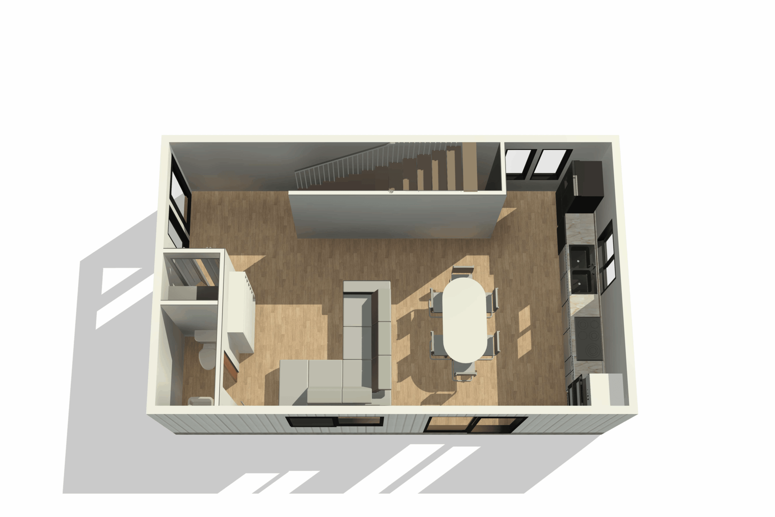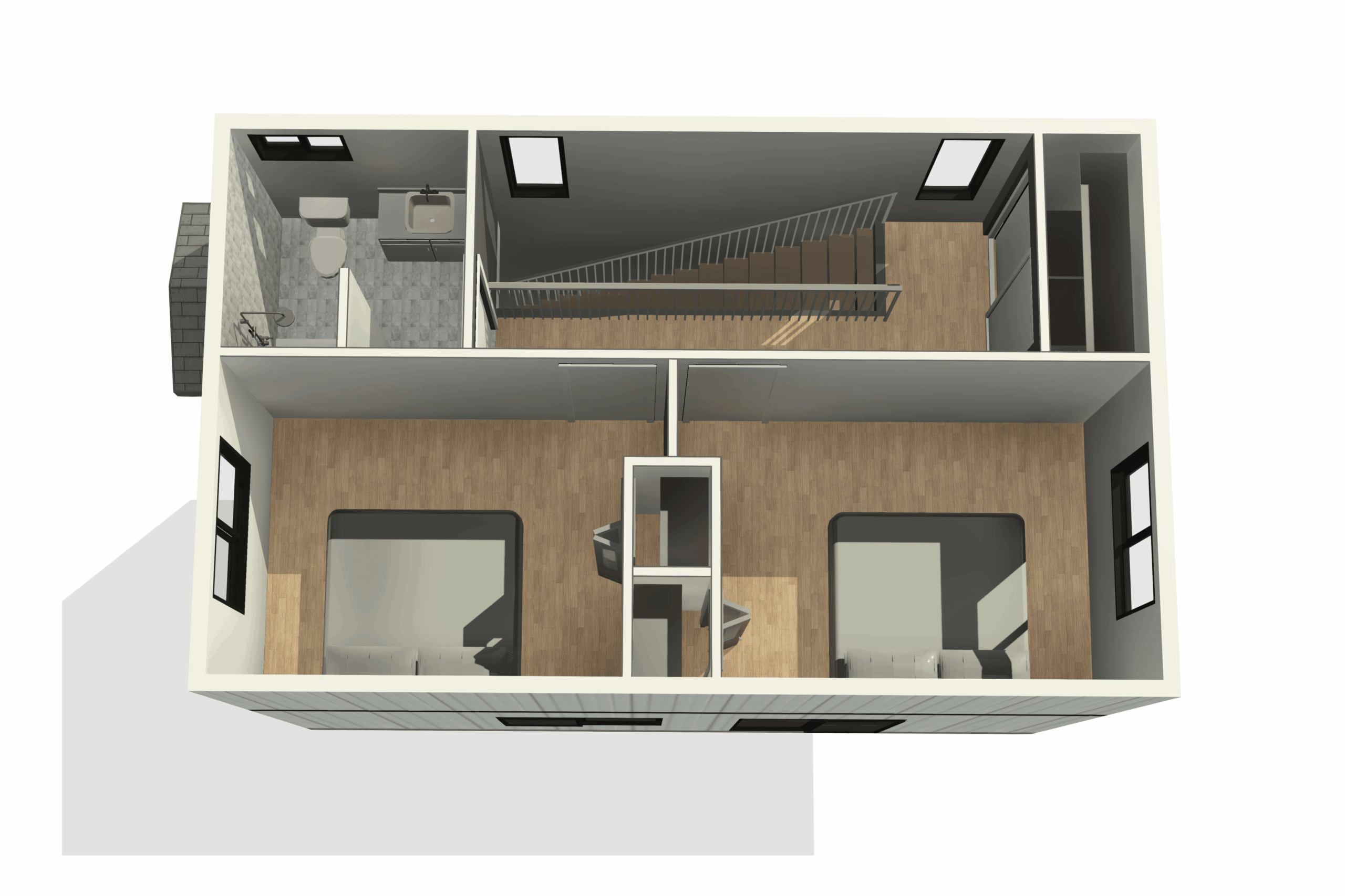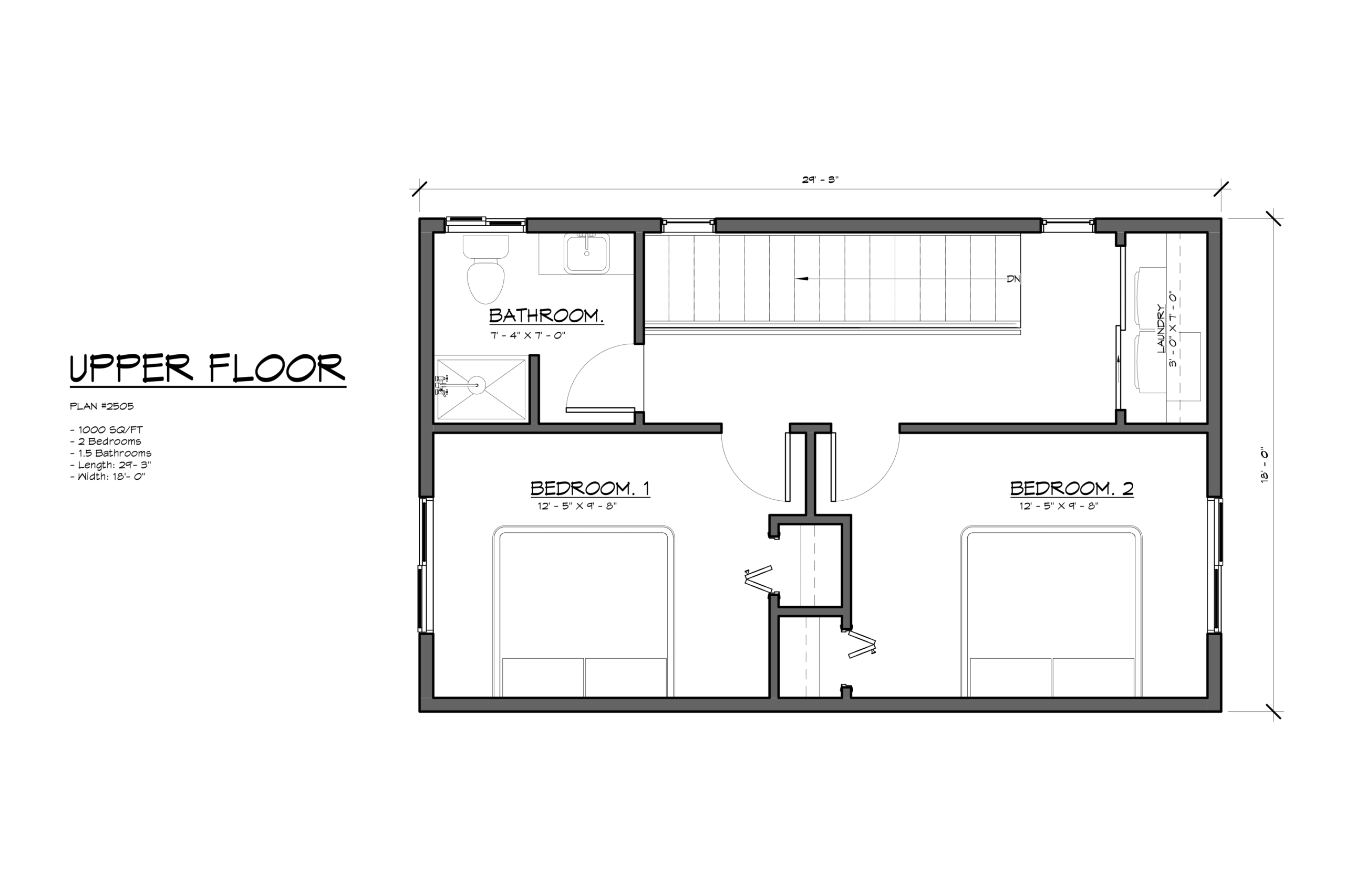 Our largest standard plan offers maximum living space in a sleek two-story design. The main floor features an open-concept layout with powder room, while upstairs provides two spacious bedrooms with a centrally located full bathroom and convenient laundry area.