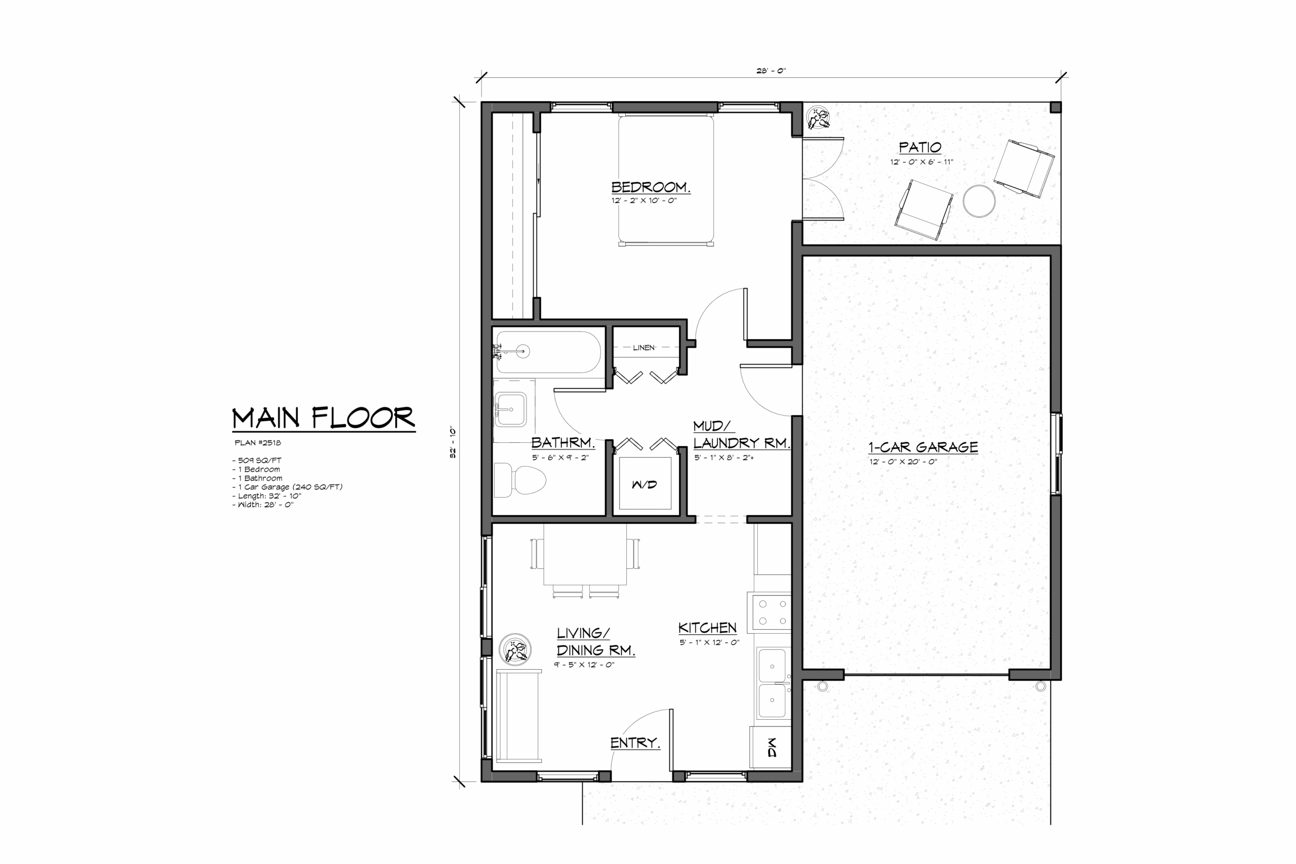 This practical unit combines living space with a single-car garage. The layout features a bedroom and living/dining area that opens onto a protected patio, with a mud/laundry room connecting the garage to the interior.