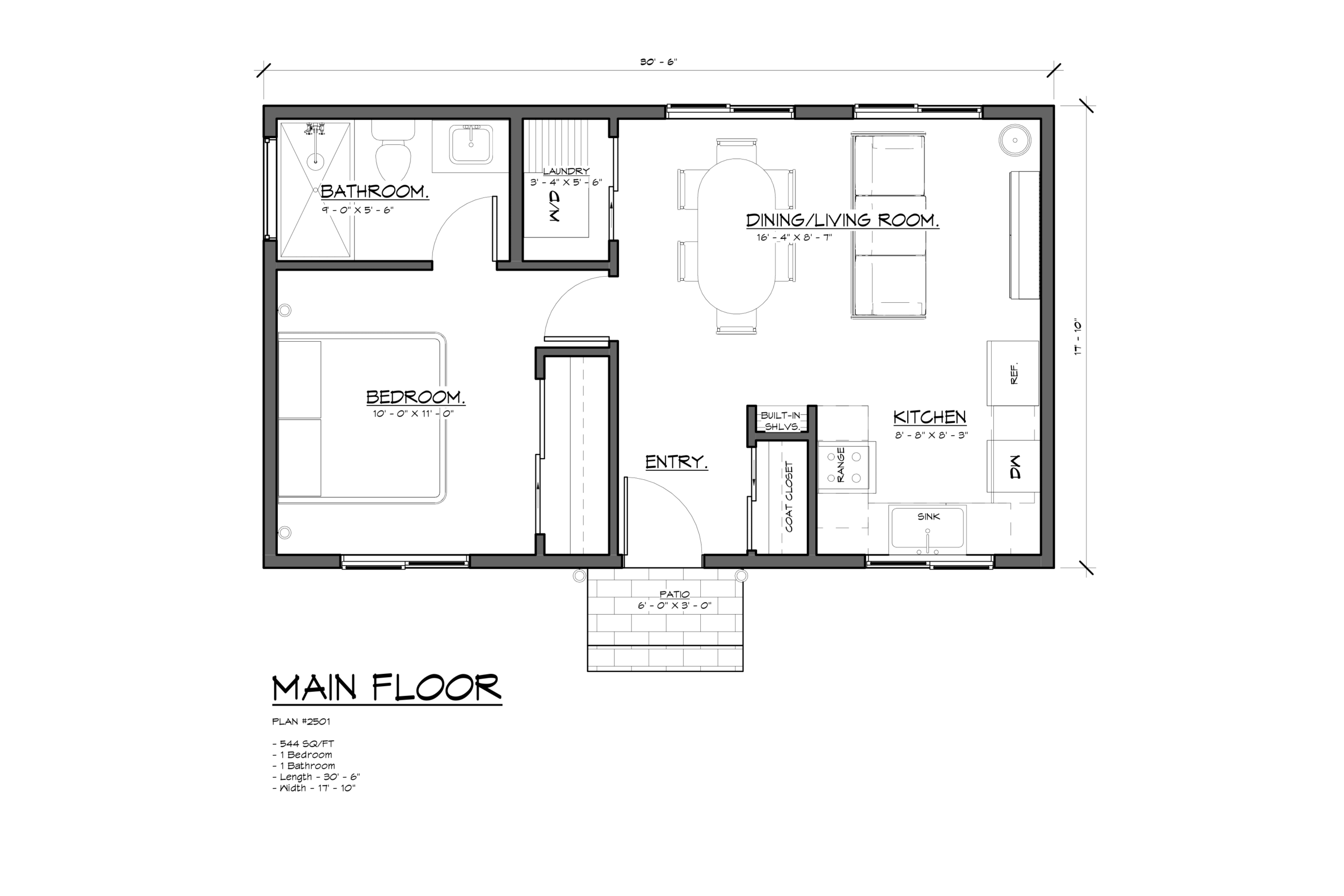 A compact and efficient single-story design perfect for an accessory dwelling unit. The floor plan maximizes space with an open-concept living and dining area adjacent to a functional kitchen. The private suite includes a bedroom, a full bathroom, and a dedicated laundry closet. The exterior features a classic gable roof with modern vertical siding and a welcoming entry patio.
