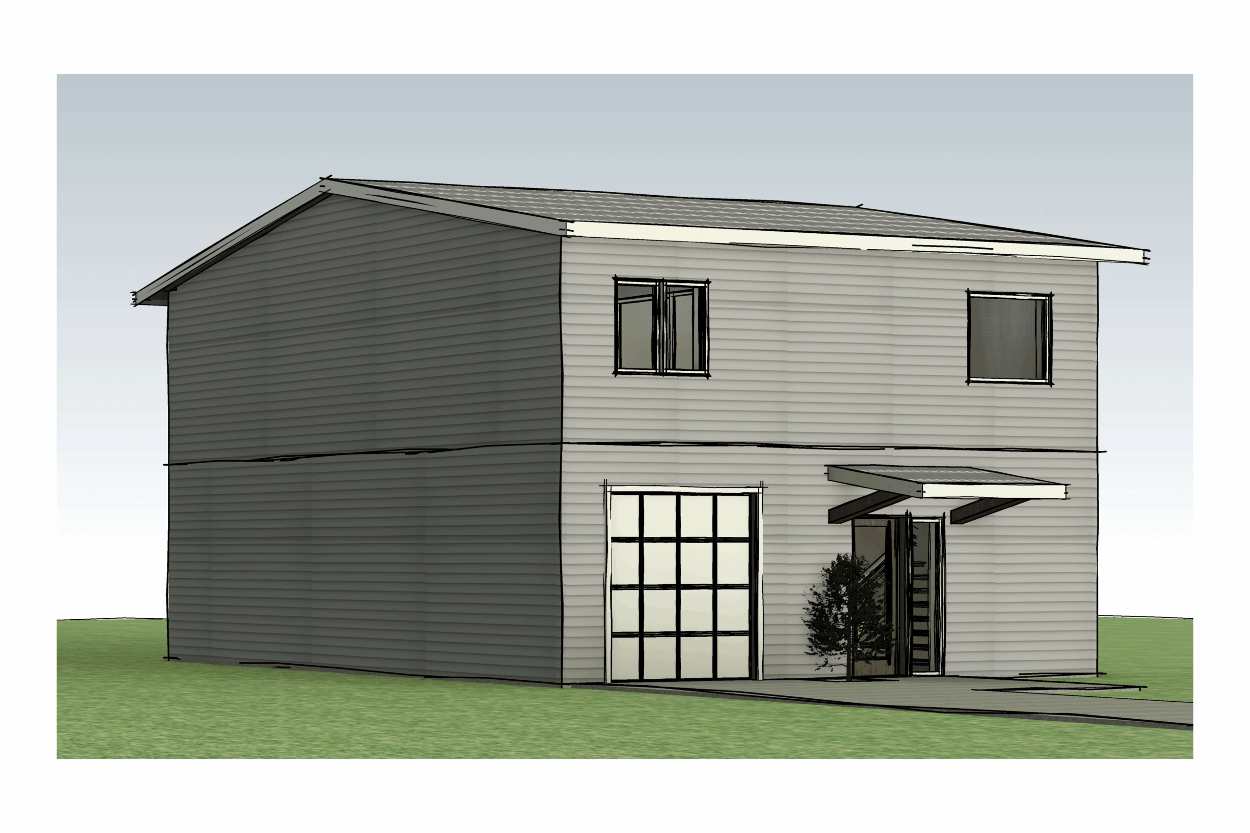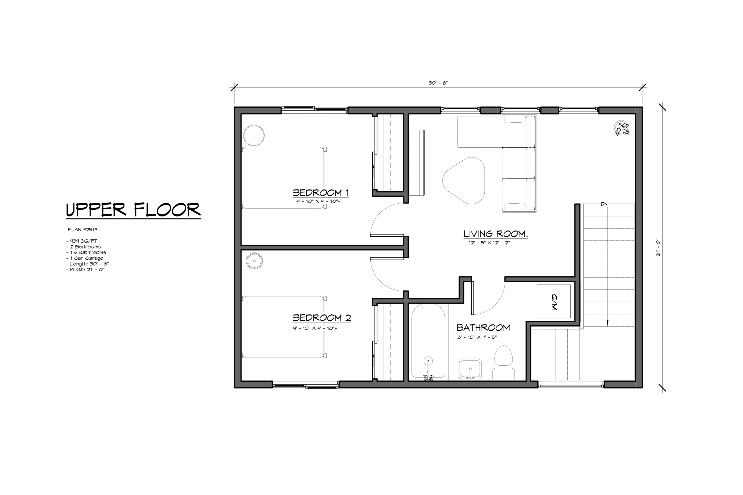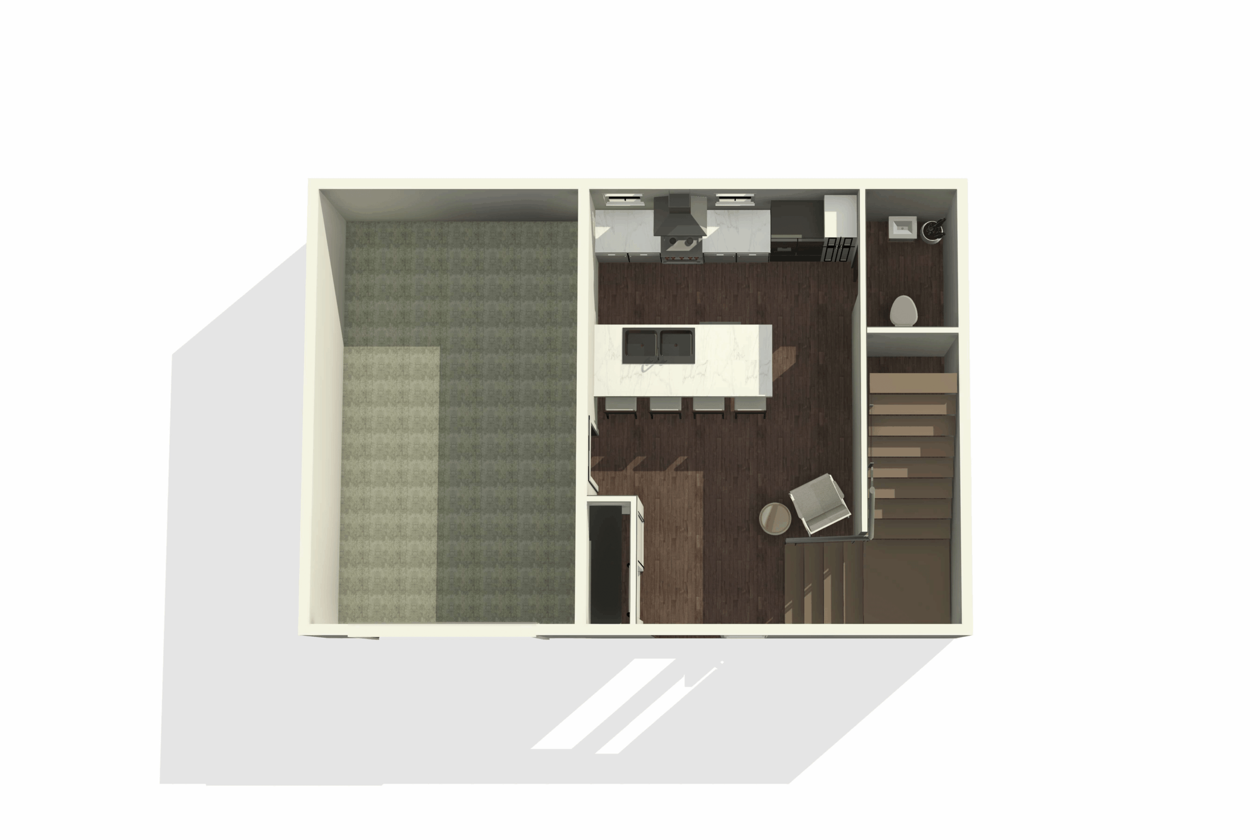 A space-efficient two-story design separating common areas from sleeping quarters. The ground floor features a kitchen with an eating bar and a powder room, while the upper floor houses two bedrooms and a full bath.
