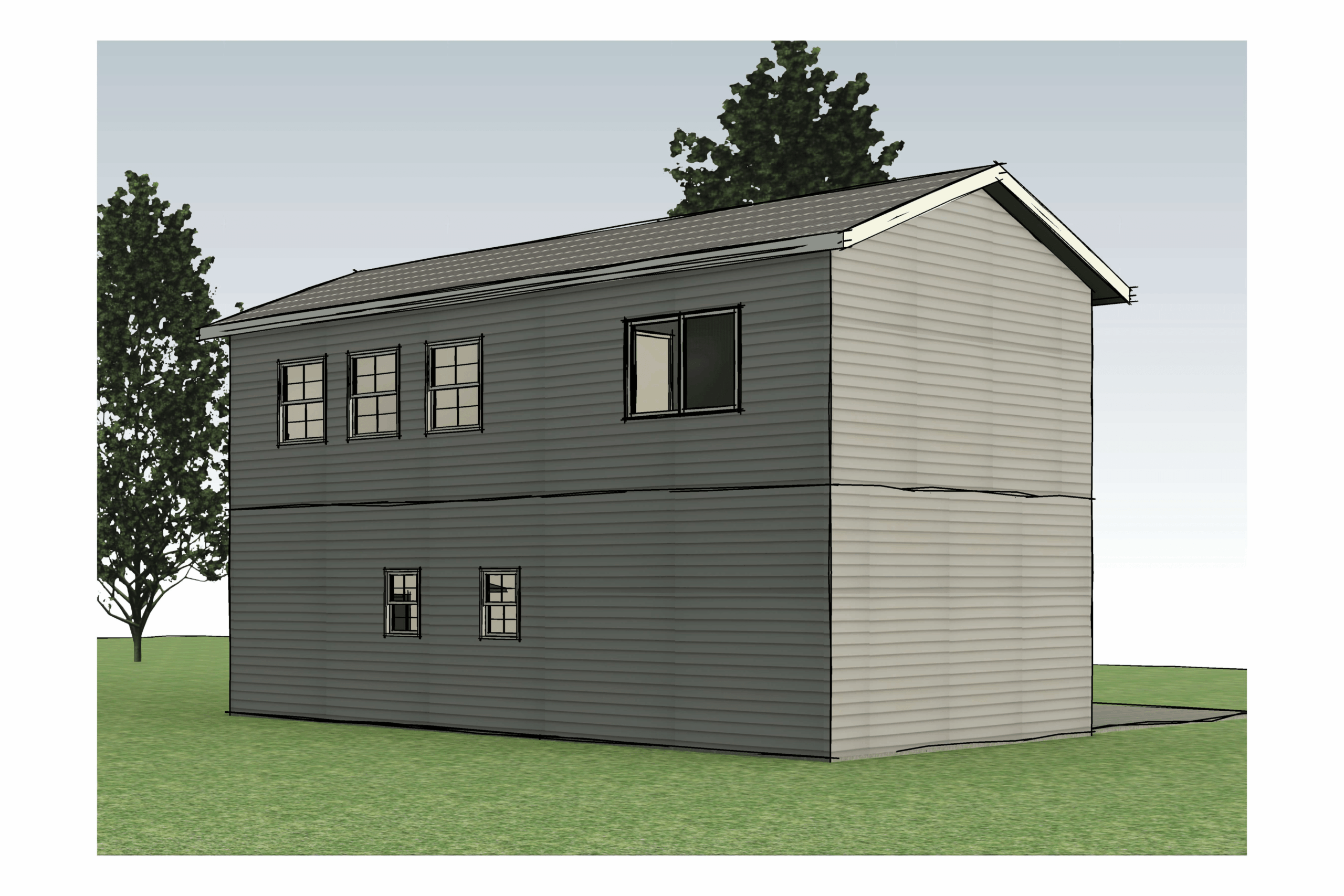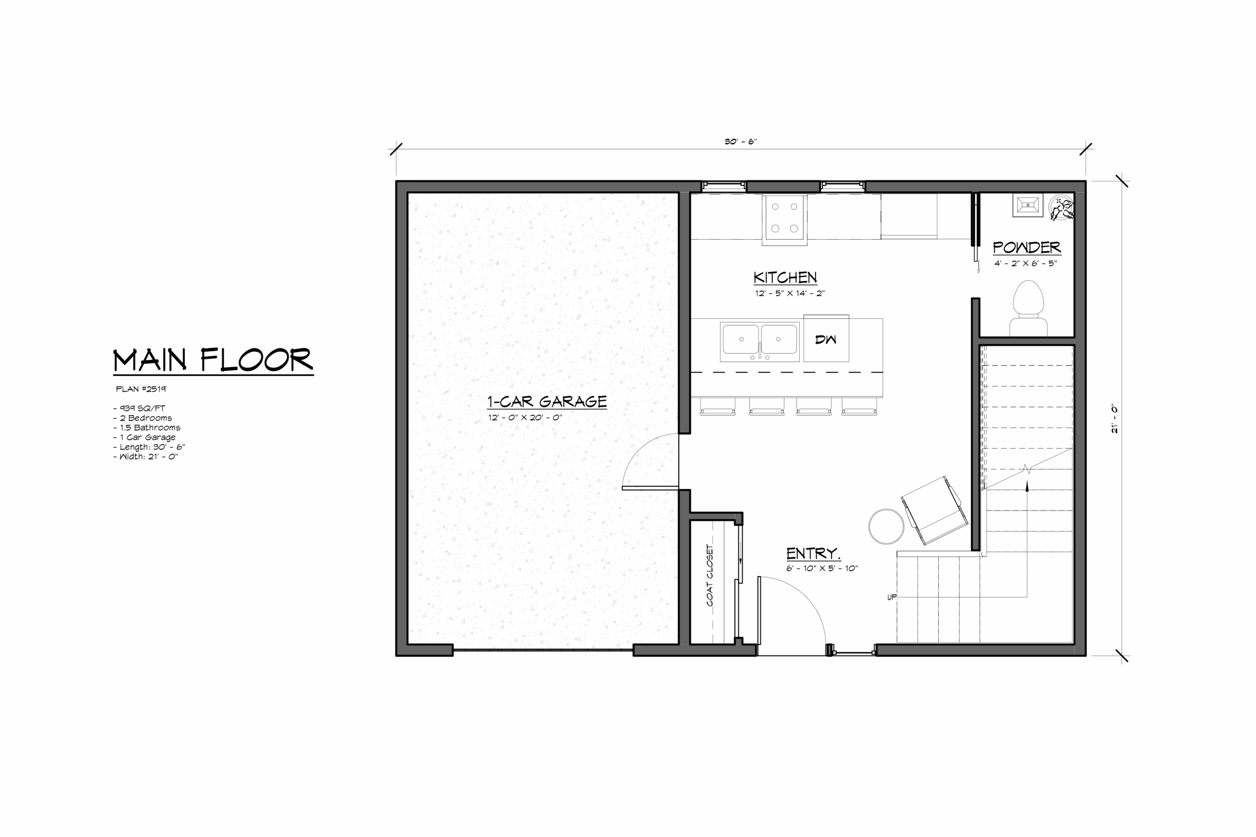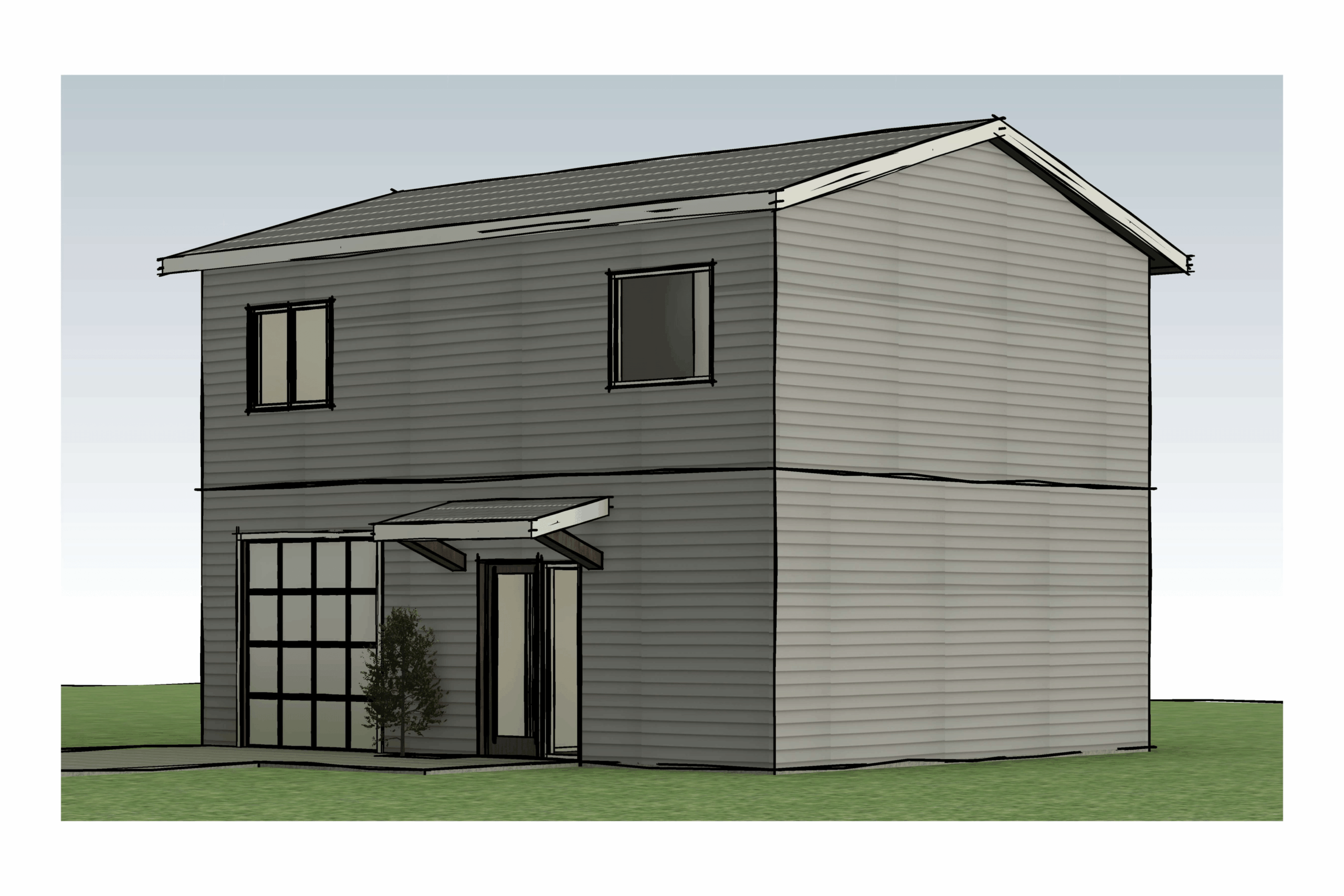 A space-efficient two-story design separating common areas from sleeping quarters. The ground floor features a kitchen with an eating bar and a powder room, while the upper floor houses two bedrooms and a full bath.