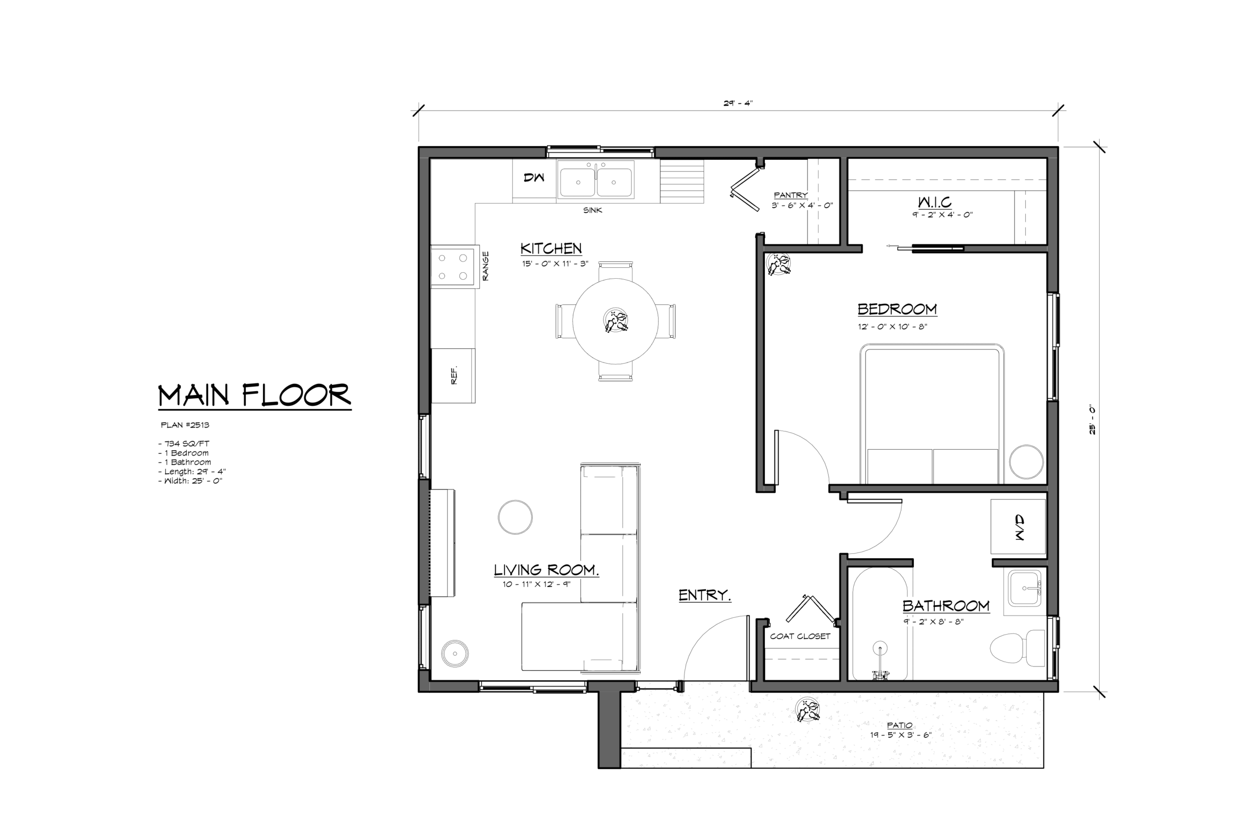 A comfortable and square-ish footprint designed for livability, featuring a large patio for outdoor enjoyment. The interior boasts a dining area, a kitchen with a walk-in pantry, and a bedroom with a walk-in closet.